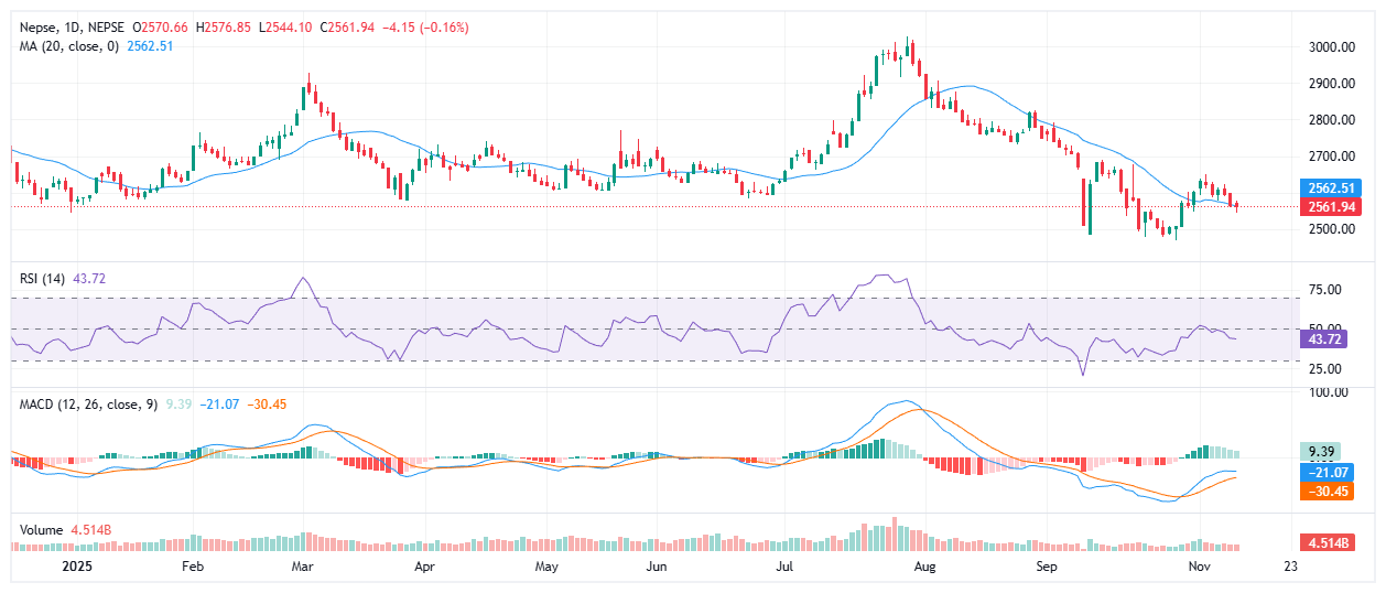 NEPSE 2570.15 अंकमा खुलेको थियो र प्रारम्भिक चरणमै खरीद दबाबका कारण सूचक 2576.85 अंकसम्म उक्लियो। तर त्यसपछि देखिएको बिक्री चापले बजारलाई तल धकेल्दै 2544.10 अंकको न्यूनतम बिन्दुमा पुर्यायो। अन्त्यतिर पुनः केही खरीद समर्थन देखिँदा सूचक आंशिक सुधार हुँदै 2561.94 अंकमा बन्द भयो।