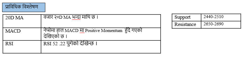 NEPSE ले आज आफ्नो मुख्य प्रतिरोध स्तर परीक्षण गर्दै रातो क्यान्डलमा बन्द गरेको छ । जसले बजारमा बिक्री दबाब बढेको संकेत गर्दछ। कारोबार अवधिभर लगानीकर्ताहरूलाई मुनाफा बुकिङ (Profit Booking) गर्दै गरेको देखिएको छ। सूचकले आजको कारोबारमा २६१३ अंकको इन्ट्राडे Low बनाएर अन्ततः थोरै माथि बन्द भएको छ।