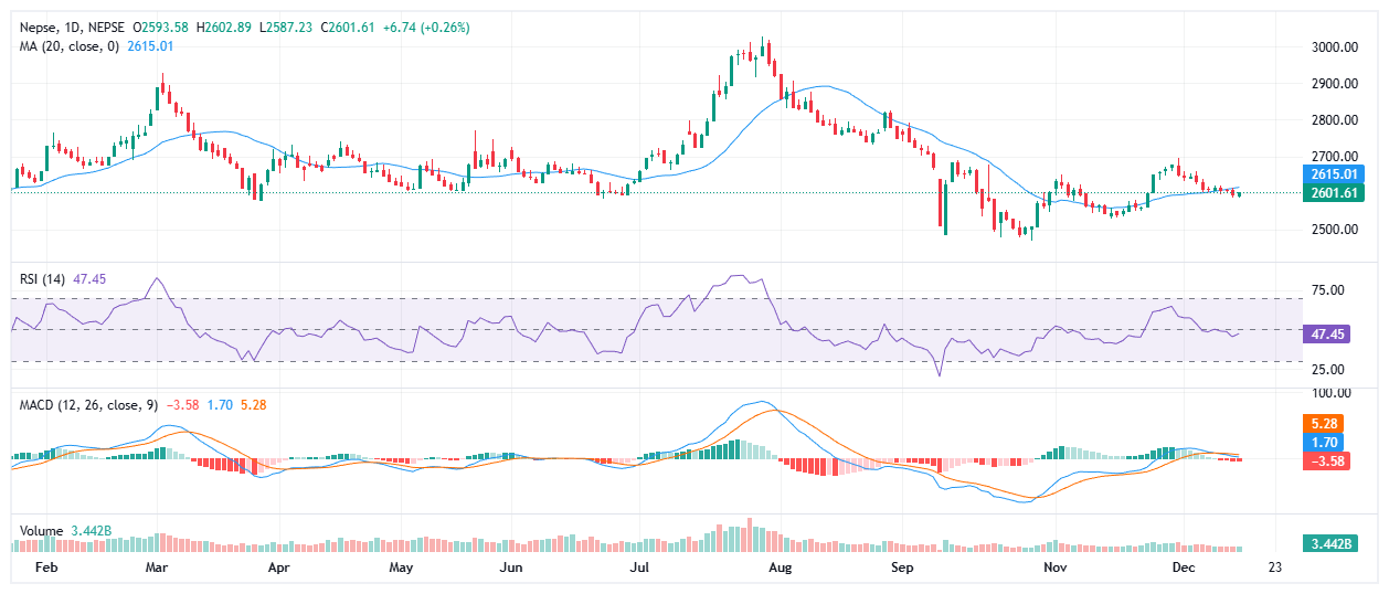 आजको कारोबार सत्रमा नेप्सेले महत्त्वपूर्ण सपोर्ट लेभलभन्दा माथि क्लोज हुँदै हरियो क्यान्डल बनाएको छ, जसले बजारमा छोटो अवधिको सकारात्मक संकेत दिएको छ। कारोबारको क्रममा नेप्से २५८७ को इन्ट्राडे लो सम्म झरे पनि त्यहीँबाट क्रमशः सुधार हुँदै हायर हाई संरचना बनाउँदै माथि उठ्न सफल भयो। यसले सपोर्ट जोनमा पुग्दा खरिदकर्ताहरू सक्रिय भएको र Selling दबाबलाई सफलतापूर्वक सम्हालिएको स्पष्ट देखाउँछ।