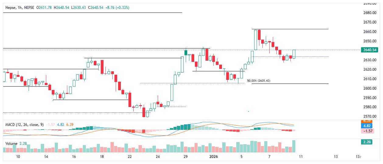 कारोबार अवधिभर नेप्से २६२०–२६३० को महत्वपूर्ण सपोर्ट लेभल वरिपरि संघर्षरत देखिएको थियो। पछिल्ला केही सत्रदेखि यो क्षेत्र अल्पकालीन माग क्षेत्रको रूपमा काम गर्दै आएको छ। आज पनि यही क्षेत्रमा बिक्री दबाब कम हुँदै गएपछि खरिदकर्ताको उपस्थिति बढेको देखियो, जसका कारण बजारले तल्लो स्तरबाट सुधारको संकेत दियो।