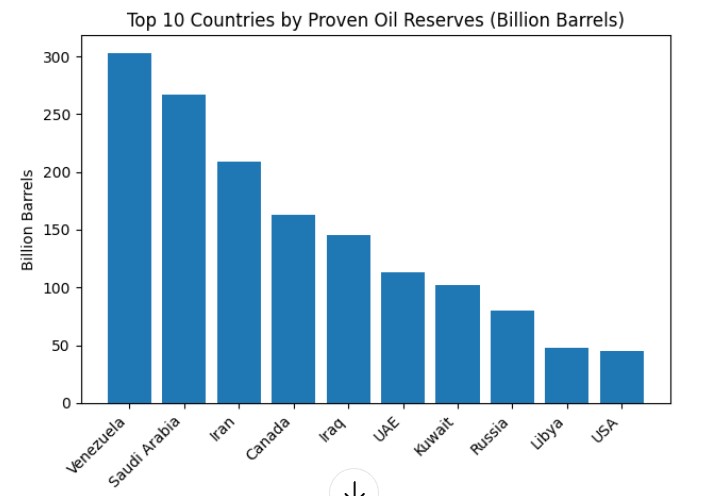 यो तथ्यांकले देखाउँछ कि केही देशहरू (जस्तै भेनेजुएला, साउदी अरब, इरान र क्यानाडा) मिलेर विश्वका आधाभन्दा बढी तेल भण्डार नियन्त्रण गर्छन् — तेल स्रोतहरू अत्यन्त असमानरूपमा वितरण भएका छन्।