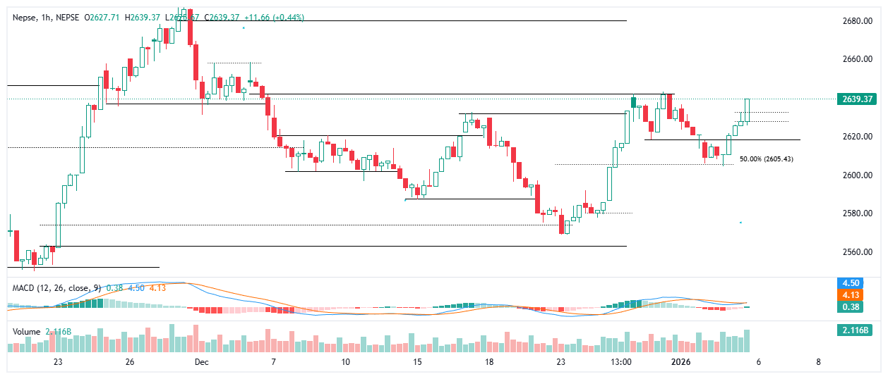 कारोबारका क्रममा २६२०–२६३० अंकको दायरा बलियो प्रतिरोध (Resistance) को रूपमा देखिएको थियो। सो क्षेत्रलाई निर्णायक रूपमा ब्रेकआउट गरेपछि सूचकले सोही माथिल्लो स्तरमा टिक्दै २६४० अंकमा बन्द हुन सफल भयो। यसले उक्त क्षेत्र आगामी दिनमा समर्थन (Support) को रूपमा रूपान्तरण हुनसक्ने संकेत गर्दछ।